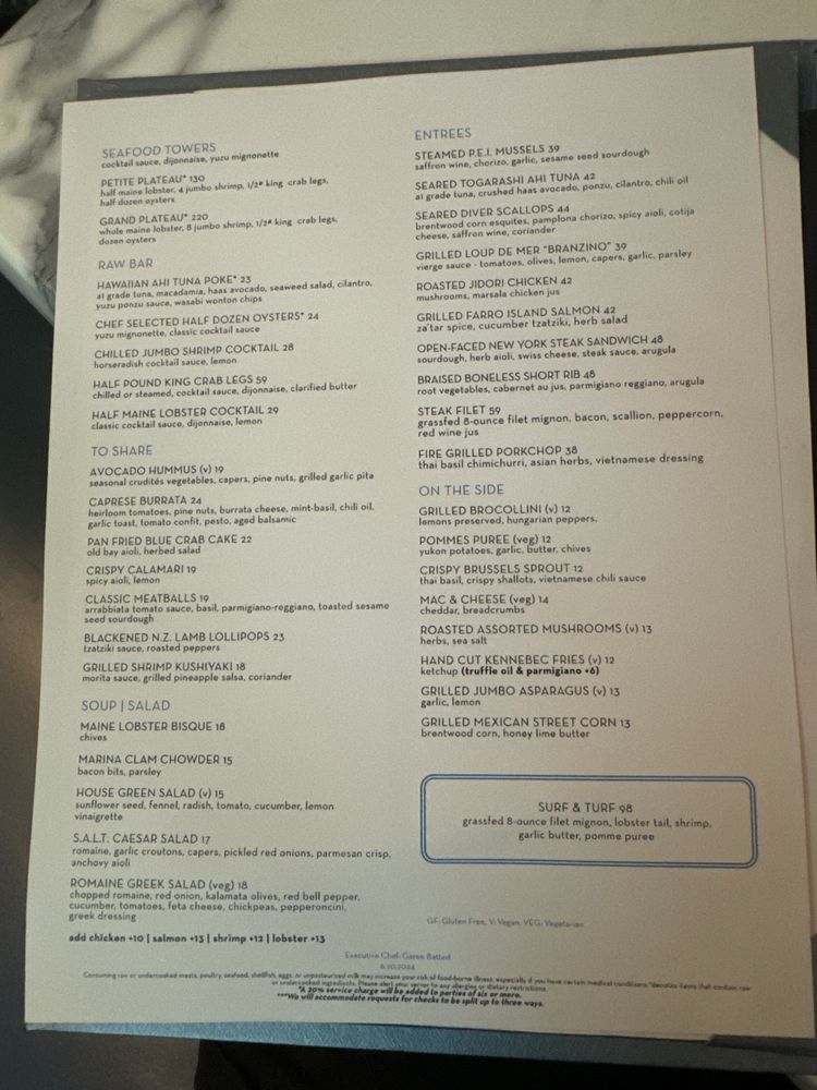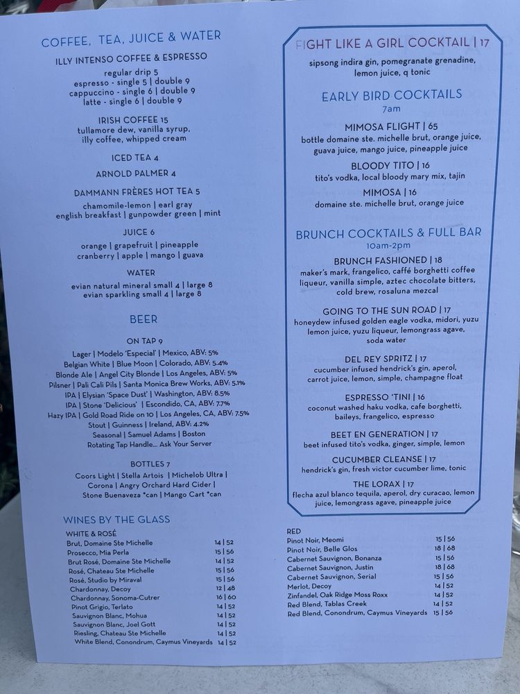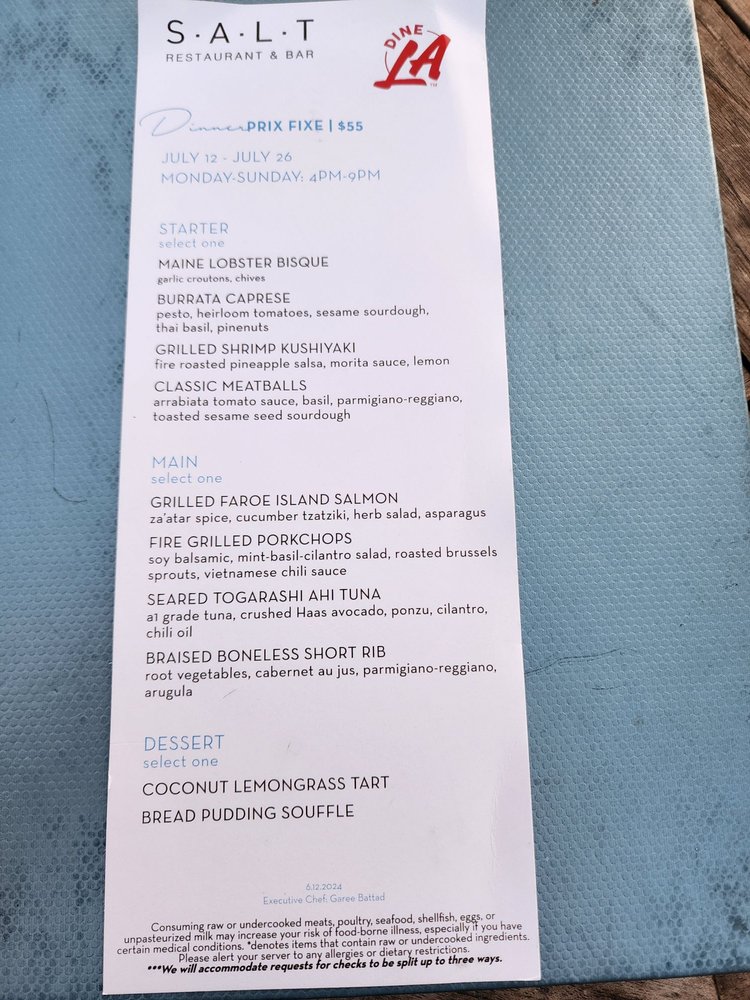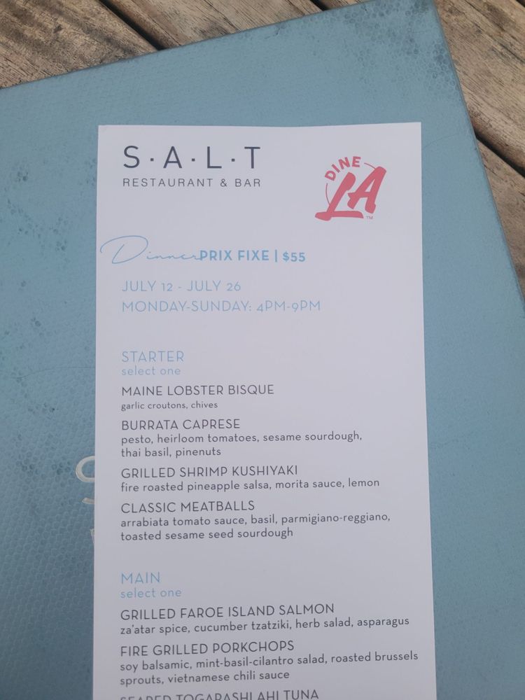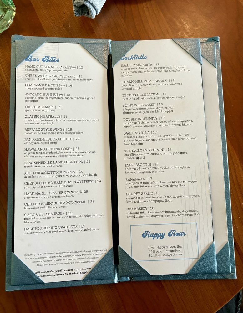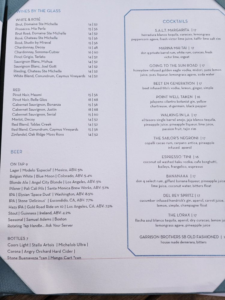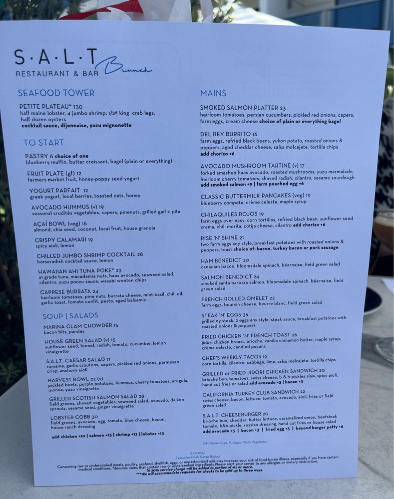 Introducing the menu at SALT Restaurant and Bar in Marina del Rey, CA. This New American gem offers a variety of options for brunch, from starters like Yogurt Parfait and Acai Bowl to mains like Steak N Eggs and Hawaiian Loco Moco. The menu also features delicious salads, soups, and mouth-watering dishes like Fried Jidori Chicken Sandwich and Blackened Mahi Mahi Fish Tacos. With a range of vegan and limited vegetarian options, SALT ensures there's something for everyone. The customer reviews rave about the ambiance, attentive service, and delectable dishes, making it a go-to spot for brunch or a romantic dinner overlooking the marina. Don't miss out on the flavorful cocktails, generous portions, and vibrant atmosphere at SALT Restaurant and Bar.